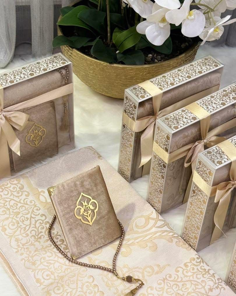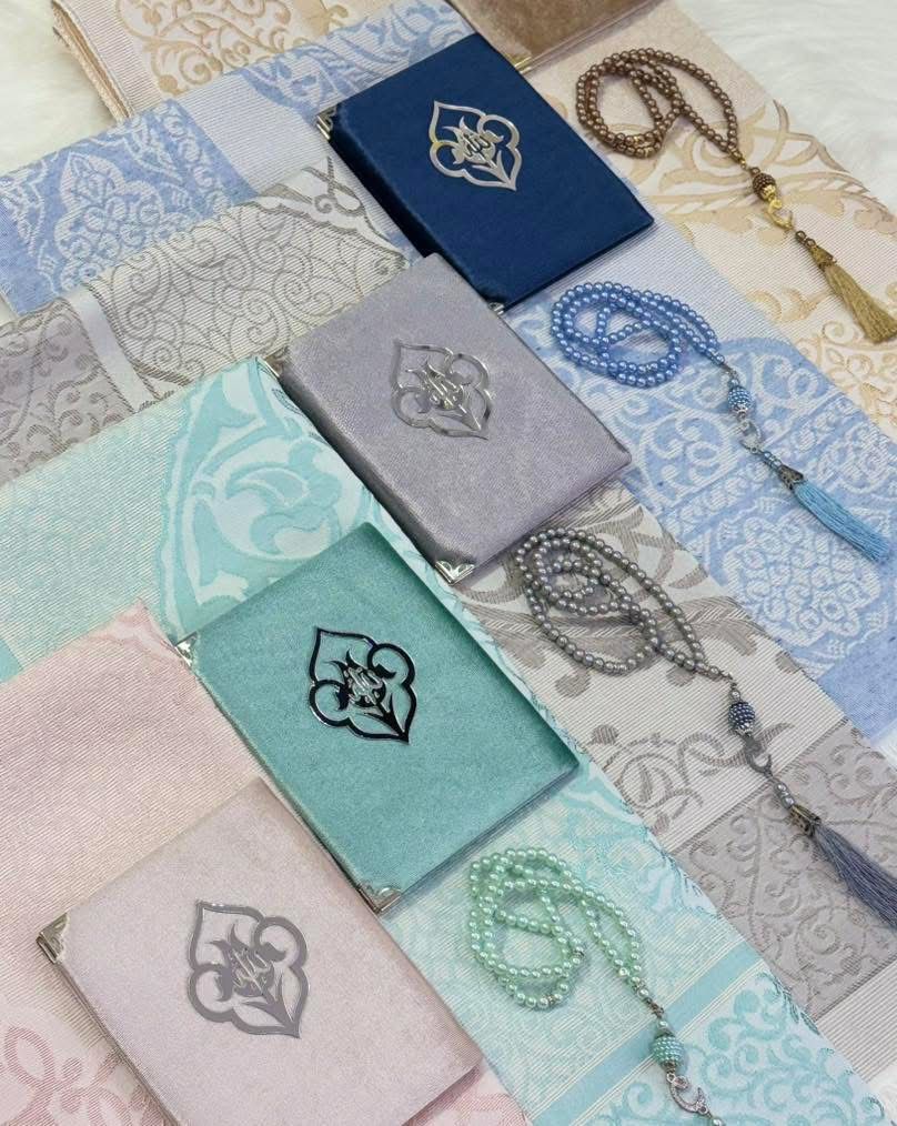 بكج مميز يضم جزءًا مجمعًا من القرآن الكريم يحتوي على سور مختارة: الفاتحة، البقرة، يس، الكهف، المعوذات، بالإضافة إلى أسماء الله الحسنى. يأتي بغطاء مخمل فاخر مطرز بلفظ الجلالة، ومرفق معه مسبحة من اللؤلؤ. مُقدّم داخل بوكس كرتون أنيق مع أكريليك، مناسب للإهداء في جميع المناسبات.